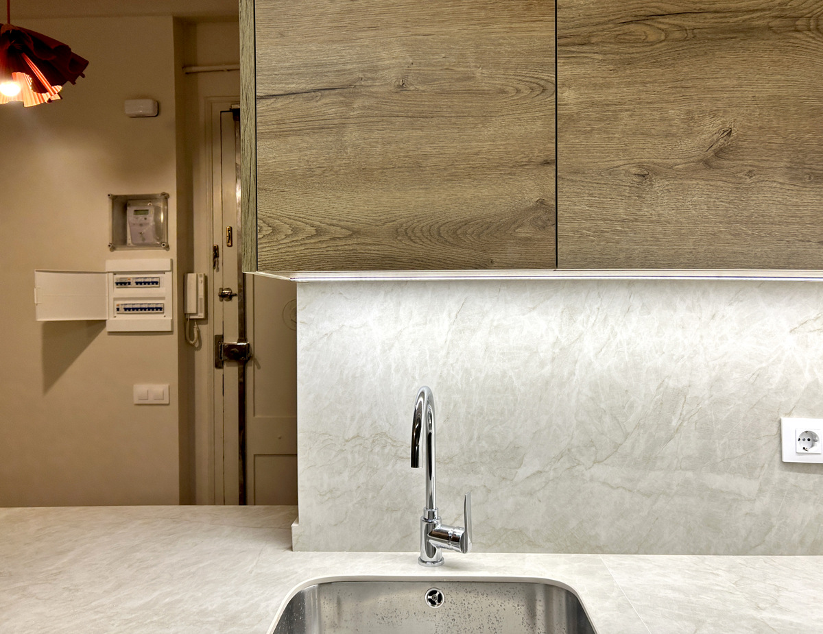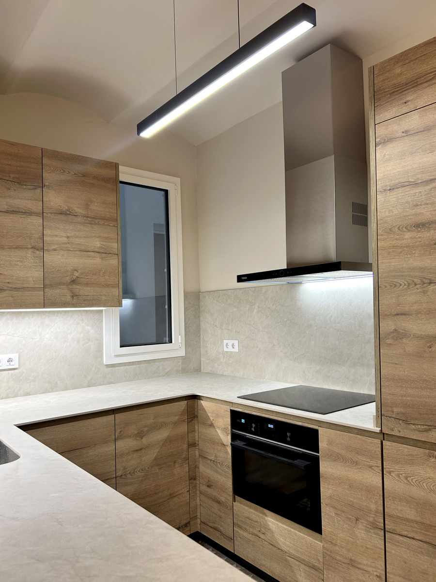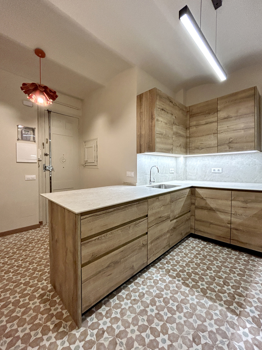 Inside the apartment, since we were removing 12 m² of roof space located in the rear patio, a layout modification was proposed to adapt it to the new area. The entire interior was renovated to include an open-plan kitchen, a double bedroom, a bathroom, and a living-dining room opening onto the private rear patio. The design and interior design were carried out in collaboration with the clients.